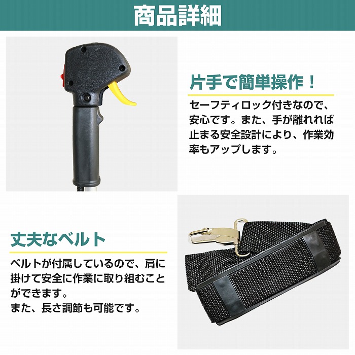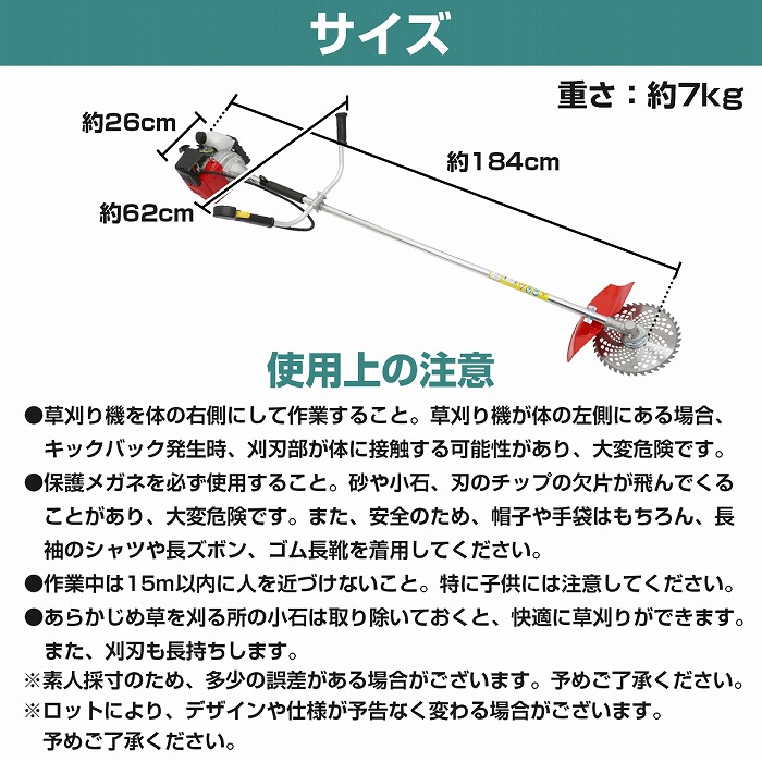 | 雑草・芝生の刈込に便利な4ストロークエンジン草刈り機です。 コンクリートや石の多い場所に最適なナイロンカッターと 頑固な雑草を刈り込むのに最適な金属刃が付いており、 状況に応じて使い分けることができます。 【片手で簡単操作】 セーフティロック付きで安心!手が離れれば止まる安全設計です。 使いやすいハンドルグリップで作業効率もアップします。 【肩掛け式】 本体は肩掛け式で、最もポピュラーな両手ハンドルタイプです。 姿勢に無理がないので、振り回し作業が楽に行えます。 【ナイロンカッター付き】 付属のナイロンコードを使えば、コンクリートやフェンスのキワなど 多少の凹凸があっても危険が少なく安心です。 先端を地面で軽く叩くだけでナイロンコードを引き出すことが可能です。 ※注意事項※ 必ずゴーグル(保護メガネ)を着用の上、使用してください。 作業中はキックバックなどによる転倒やケガに十分な注意が必要です。 |