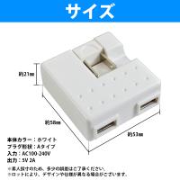 | ・サイズ(約):58×53×21mm ・本体カラー:ホワイト ・プラグ形状:Aタイプ ・入力電圧:AC100-240V ・出力電圧/電流:5V 2A ※入力電圧がAC100V-240V対応のため海外でも使用可能ですが、プラグ形状が異なる場合は変換コネクターが必要です。 ※本製品は、製品の仕様上すべてのUSB充電機器の組み 合わせで使用できることを保証するものではありません。 ※ケーブルは付属しておりません。 充電時は、ご使用になる機器に対応したケーブルを別途ご用意ください。 ※充電機器の組み合わせにより、2台同時に充電できない場合があります。 ※本製品を使用した事による、直接的もしくは間接的に生じた損害・破損(データを含む)については、弊社では一切責任・保証を負いません。 |