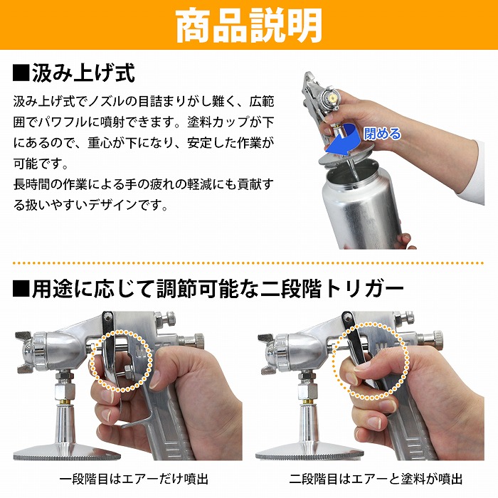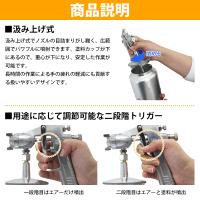 | コンプレッサーに接続して使用するエアツール! ▼汲み上げ式▼ 下カップの汲み上げ式でノズルの目詰まりを防止し、 広範囲でパワフルに噴射できます。 塗料カップが下にあるので、重心が下になり、安定した作業が可能です。 長時間の作業による手の疲れの軽減にも貢献する扱いやすいデザインです。 ▼塗装作業にパターン調整▼ パターン・吐出量・空気量が調節可能なので、 きめ細かな美しい仕上がりが期待できます。 本格派の方から一般の方まで幅広く使用できます。 トリガーはエアーのみとエアー&塗料が噴出する二段階構造です。 |