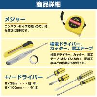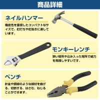 | ◆セット内容: ・カッター ・ネイルハンマー ・+/-ドライバー(6×38mm:各1本、6×100mm:各1個 ) ・検電ドライバー ・メジャー 2m ・ペンチ ・モンキーレンチ(8") ・電工テープ ・ケース ◆重量(約):900g ◆ケースサイズ(約):26.5cm×5.5cm×21.2cm ※当商品は海外製品のため、多少の傷、汚れなどがある場合がございます。 予めご了承の上、お買い求め下さい。 ※ロットにより、デザインや仕様が予告なく変わる場合がございます。 |