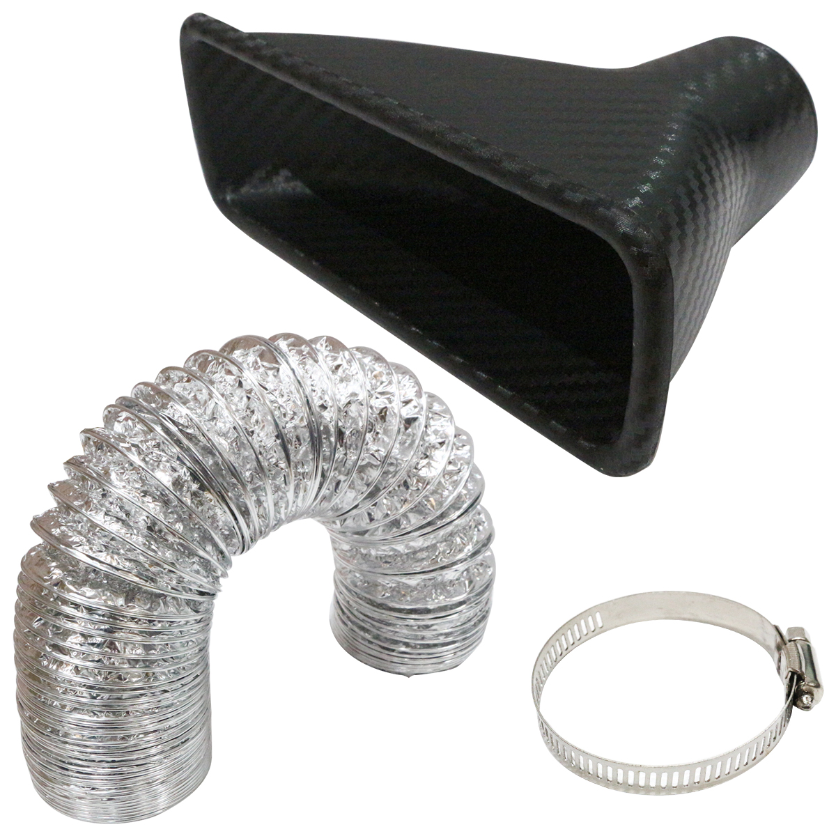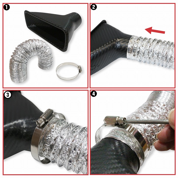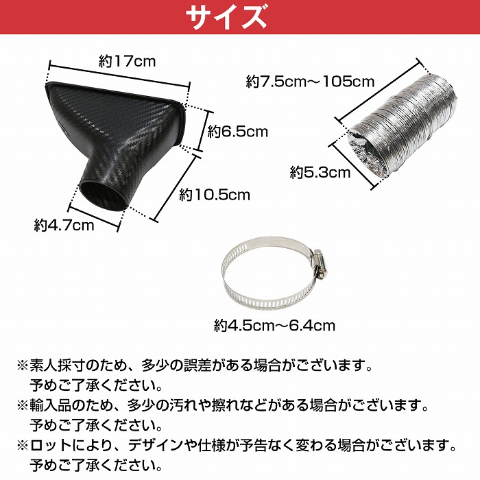 | 汎用 エアインテークダクト ドライカーボン柄 汎用品タイプなので、サイズと形状が合えば記載の車種以外にも取り付け可能です。 |
