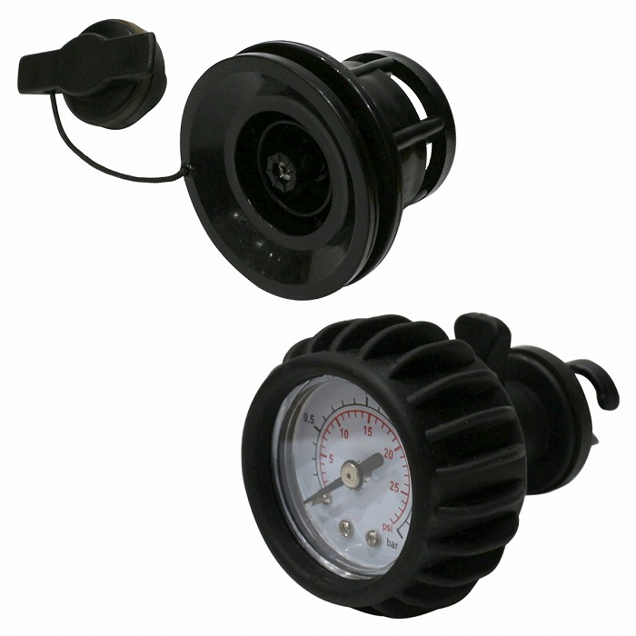 | SUP、ゴム製ボートなどの空気圧を計るメーターです。 ●ボートの空気挿入口(バルブ)にはめるだけで、空気圧がゲージに表示されます。 ●測定範囲は0-2 BARまたは0-30 PSIの2パターン表示でデータの読み取りが簡単にできます。 ●高圧ハンドポンプ、エアポンプ、エアバルブと併用できます。 <使用方法> バルブの奥にゲージを差し込み、ねじ込むように左右に回すとゲージの針が動きます。 エアーの量や空気圧が低い場合は作動しませんので、ご注意ください。 |