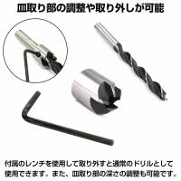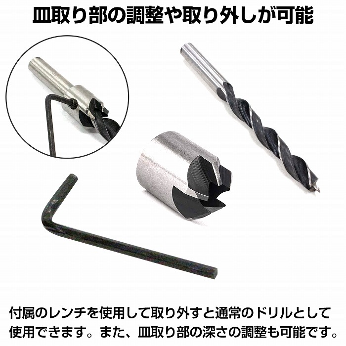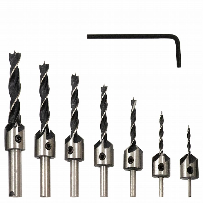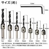 | 【セット内容】 皿穴ドリルビット7本 : 3mm 4mm 5mm 6mm 7mm 8mm 10mm 付属品 : 六角レンチ |