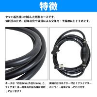 | ヤマハ船外機に対応した燃料ホースです。 消耗品のため、経年劣化や破損による交換用・予備用におすすめです。 ●ホースは「内径8mm/外径12mm」と太く丈夫で、低〜高馬力の船外機に対応しております! ●両端にはコネクター付き!プライマリーポンプと一体型になっております。 |