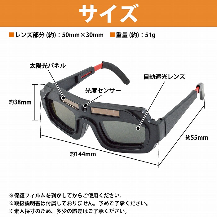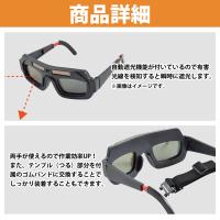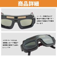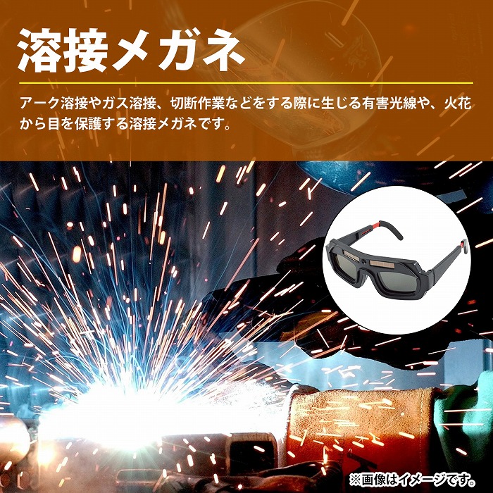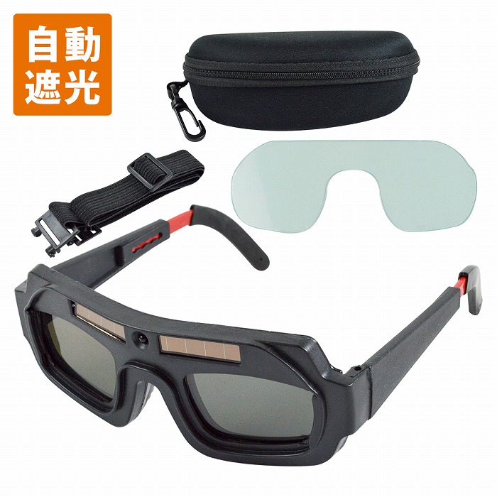 | アーク溶接やガス溶接、切断作業などをする際に生じる有害光線や 火花から目を保護する溶接メガネです。 ●自動遮光機能が付いているので有害光線を検知すると瞬時に遮光。 ●両手が使えるので作業効率UP! また、テンプル(つる)部分を付属のゴムバンドに交換することで しっかり装着することも可能です。 ●ソーラー充電式なので電池や充電は不要! 太陽光や溶接光で充電を行います。 ●メガネタイプのため、溶接面と比べて軽量で長時間の使用でも疲れにくい! |