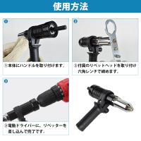 ・電動ドライバー用 リベットガン お手持ちの電動ドライバーやインパクトドライバーに装着することで、 リベッターとしてご使用いただけます。 ★4サイズのリベットヘッド付属 【ご注意】 ※インパクトドライバーの場合、標準チャックは6.35mmのものが大半です。 本商品の装着には、8Φの六角軸に対応したドリルチャックが別途必要になります。 予めご了承ください。 ※電動ドライバーは付属しません。 |