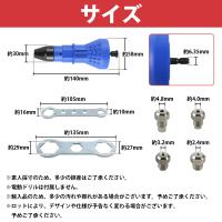 【 対応工具】 電動ドライバー/インパクトドライバー ドリルチャック:6.35mm(六角軸) 【対応リベットヘッド(直径サイズ)】 ・2.4mm ・3.2mm ・4.0mm ・4.8mm ・レンチ:2本 サイズ:詳細は画像にてご確認ください。 ※素人採寸のため、多少の誤差はご了承ください。 ※電動ドリルは付属しません。 ※輸入品のため、多少の汚れや擦れがある場合がございます。予めご了承ください。 ※ロットにより、デザインや仕様が予告なく変わる場合がございます。 予めご了承ください。 |