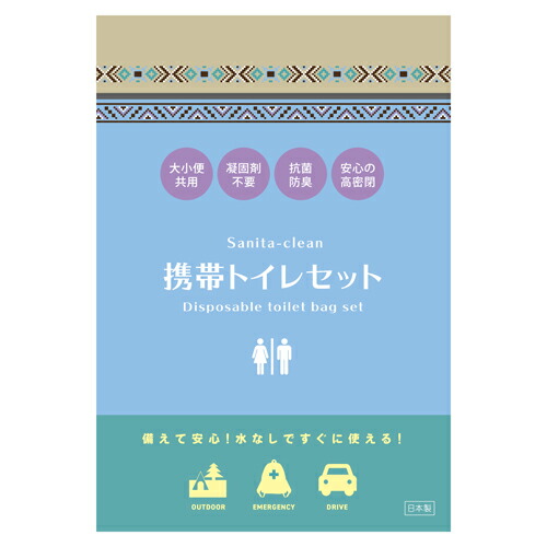 においや内容物をもらさない超防臭チャック袋付き、1回分がセットになった携帯トイレです。水分を素早く固める凝固シートと袋が一体化しています。袋の上部を切り取れば結びヒモとして、使用後に袋の口を縛ることができます。