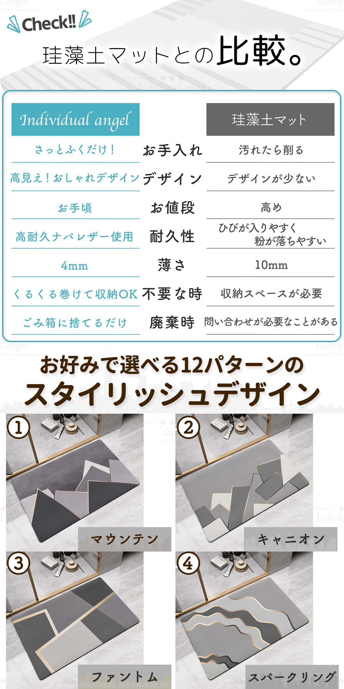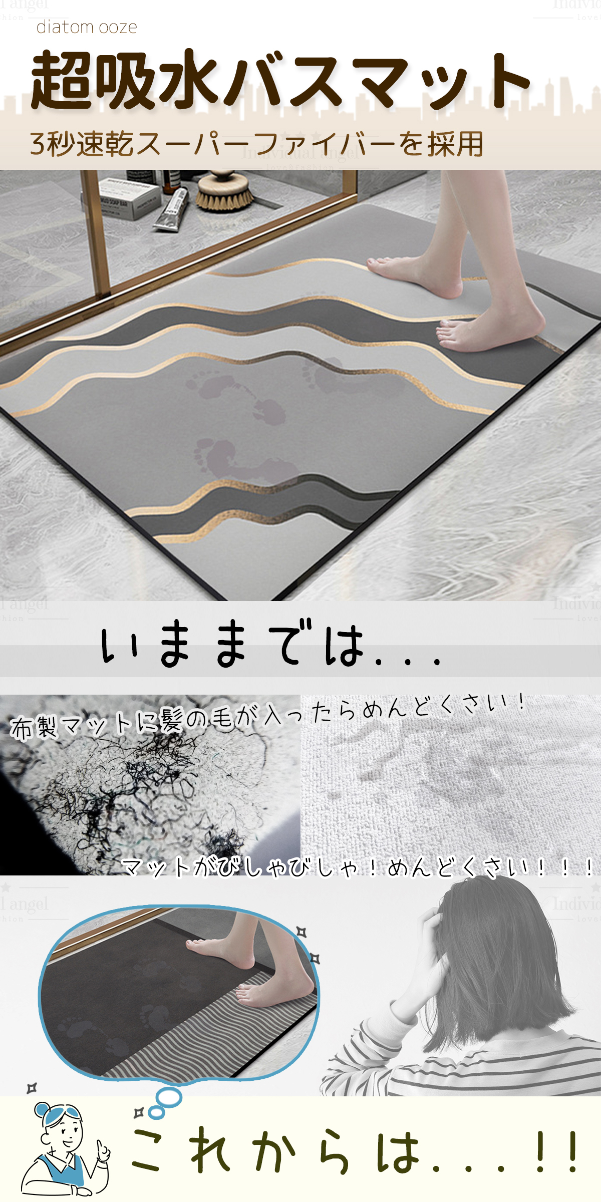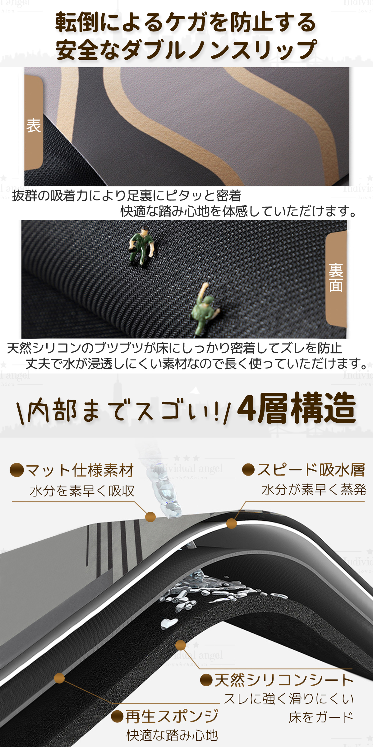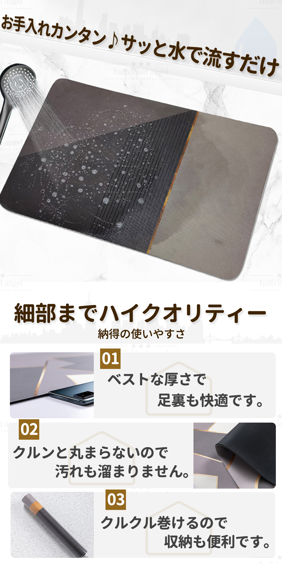 水をしっかり吸い取ってくれ毎日清潔に使えます。汚れたらサッとふきとるだけ!バイ菌やカビ菌、ダニなどの繁殖を抑え、室内のいやな臭いまで吸着してくれます。