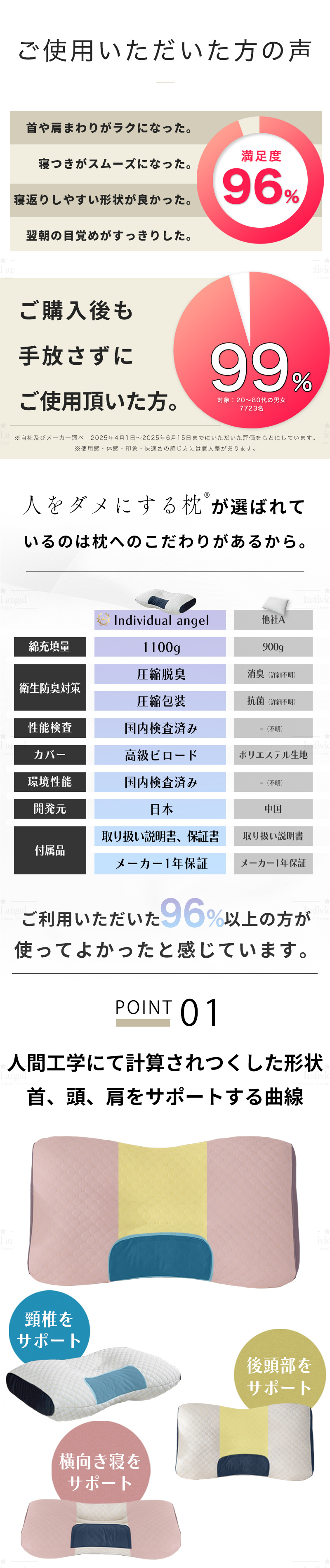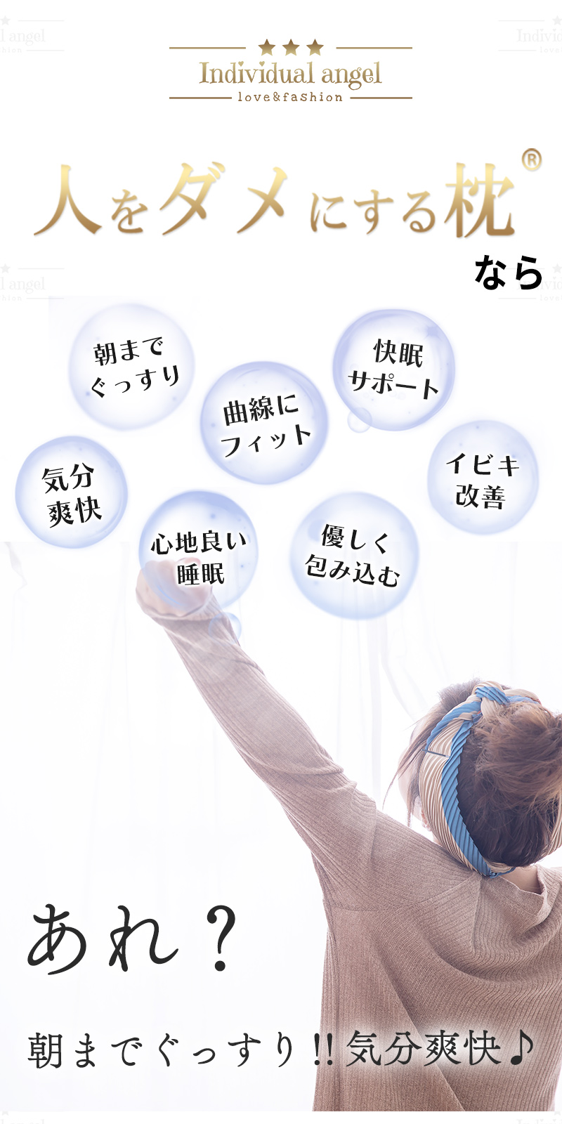 いびき・不眠症・首こり・寝返りなどの原因は枕にあるかもしれません。Individual angelの枕がサポートします。