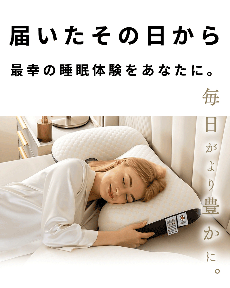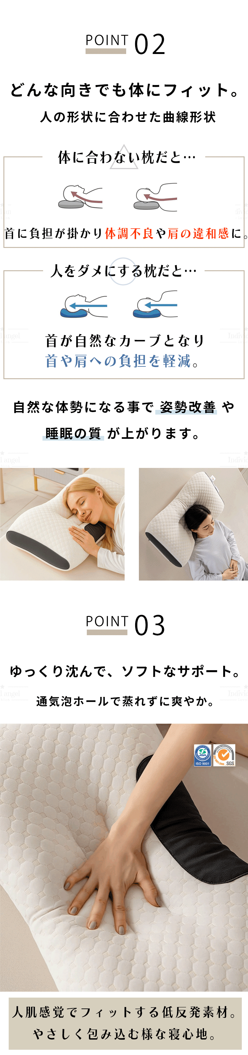 頸椎にぴったりとフィットし、睡眠を優しくサポートします。姿勢を安定させ、首や肩を優しく保持してくれます。