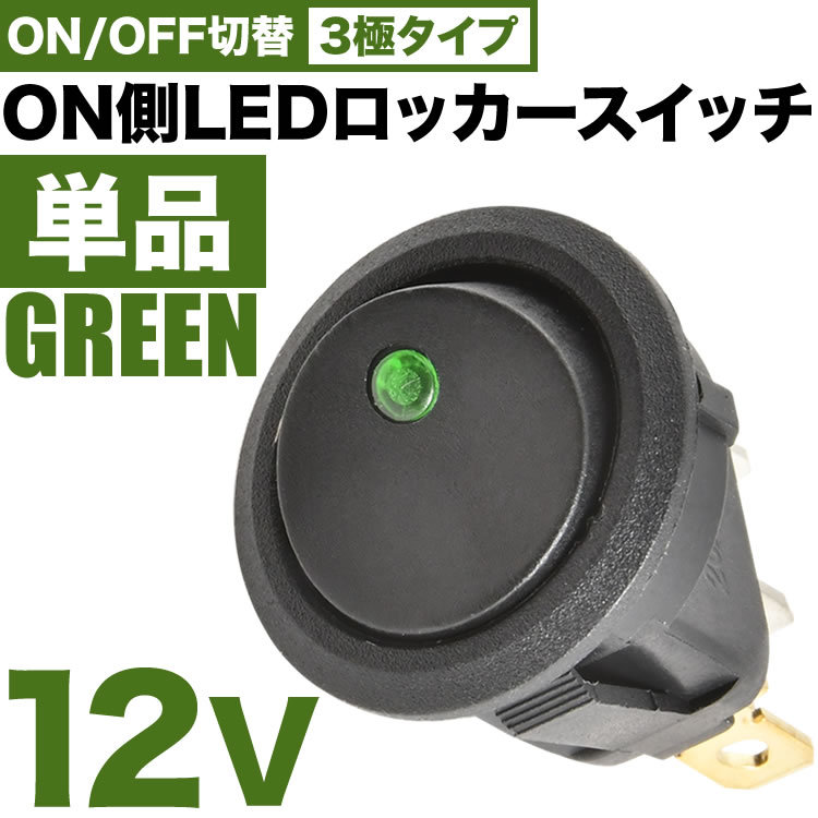 ON側LED発光 丸型 ロッカースイッチ グリーン 単品 ロッカスイッチ ON OFF スイッチ 3極 DC12V 汎用 sw10