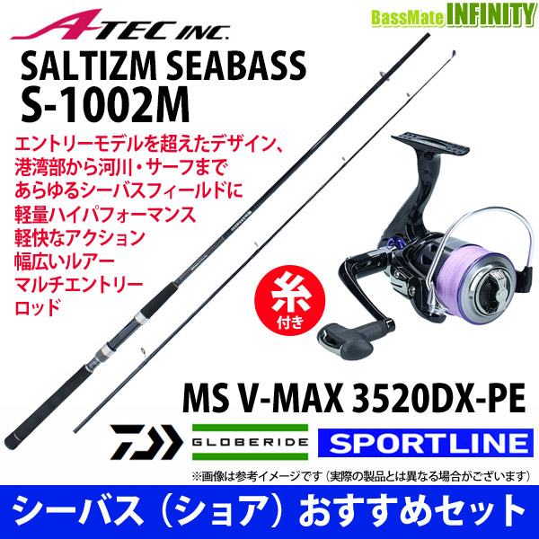 【フロロリーダープレゼント!】【送料無料】【PE2号-200m糸付】【シーバス入門セット】エイテック ソルティズム S-1002M+スポーツライン MS V-MAX 3520DX-PE