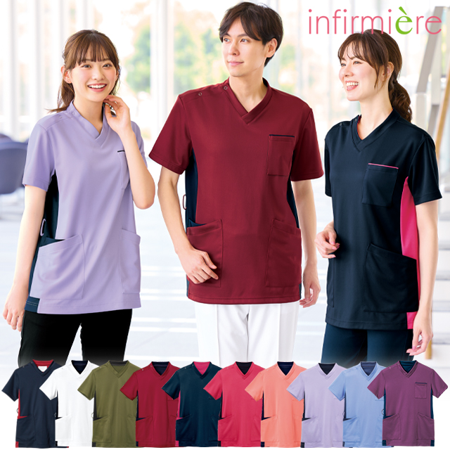 スクラブ 医療 白衣 メンズ レディース ナース服 ナーススクラブ ナースウェア アンファミエ パウダーストレッチ 脇配色スクラブ(男女兼用)