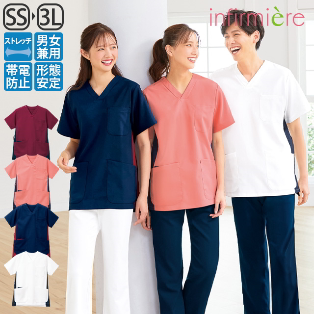スクラブ 医療 白衣 メンズ レディース ナース服 ナーススクラブ アンファミエ ストレッチギャバ制電脇配色後ろポケット付きスクラブ(男女兼用)