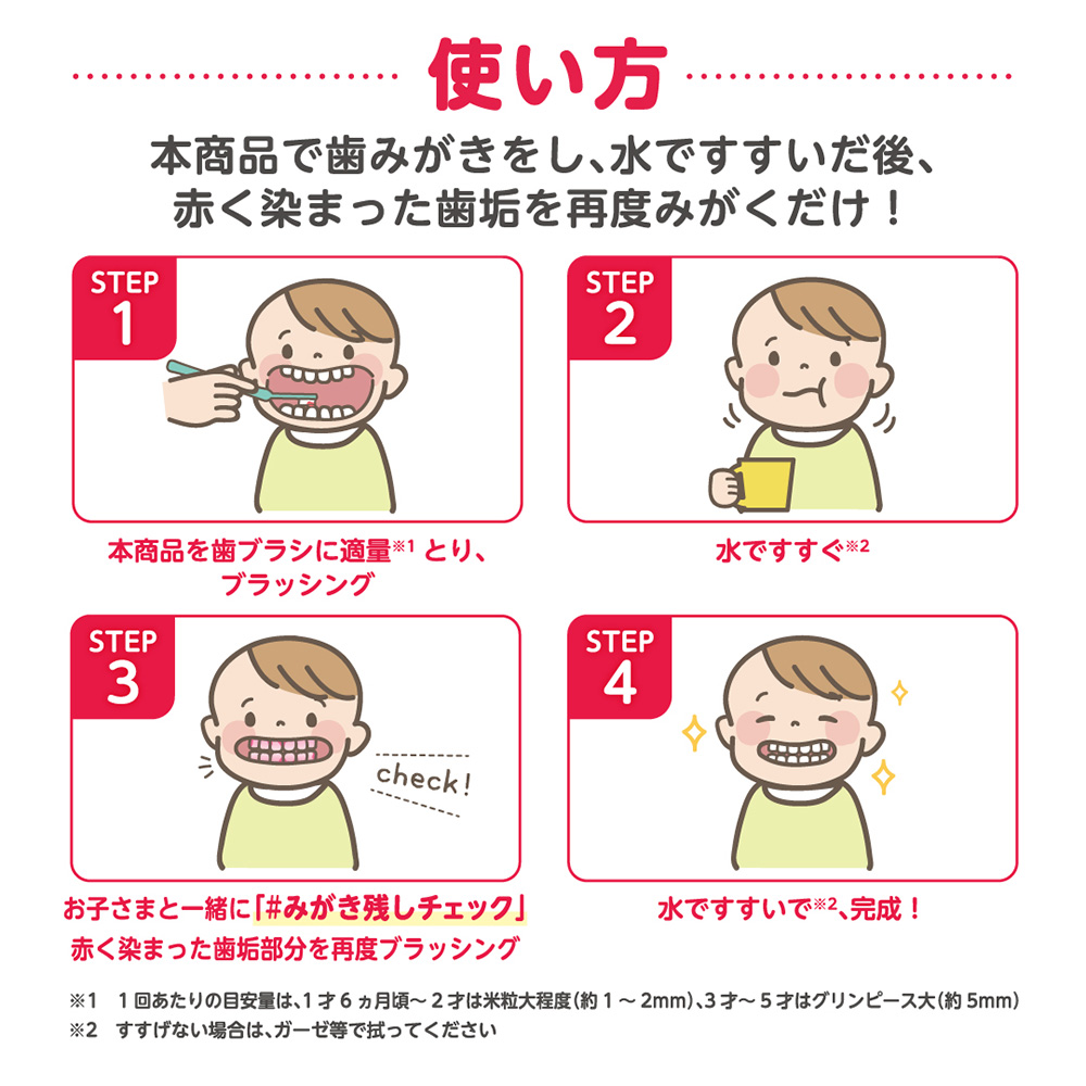 歯垢を赤く染めることでみがき残しチェックができる、いちご味の歯みがき剤です。