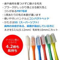 またナイロンは水分を含むとコシがなくなりますが、PBT毛材は水はけが良く、開封時と同じ状態を保てます。コシがしっかりしているので、狙ったプラークをしっかり除去出来ます。