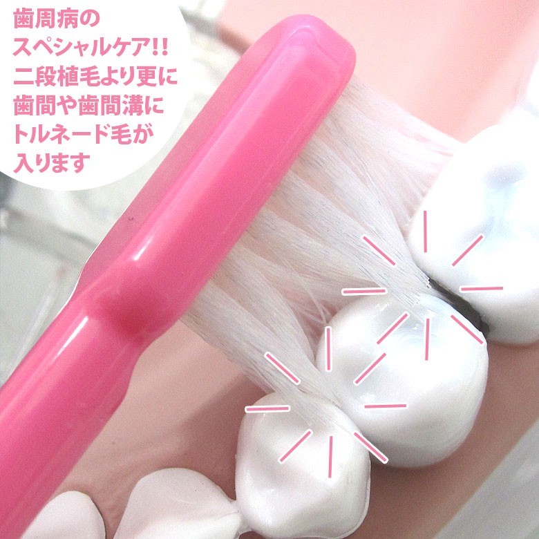 長めの超極細毛と短めのラウンド毛の組み合わせにより、歯冠部や歯周ポケットにも無理なく毛が届きます。
