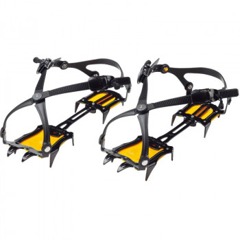 | 左右のバックルで締める「Vクロスバンド・2バックルシステム」が着脱をスムーズにします。前後のスタビライザーがしっかりと靴を固定しワンタッチで調節が出来るうえ、不意の緩みを防ぐバックルストッパーを標準装備です。つま先から爪が出ないので安心して歩けます。 ※冬期登攀用の12本爪アイゼンとは設計思想が違いますのでご注意ください。 |