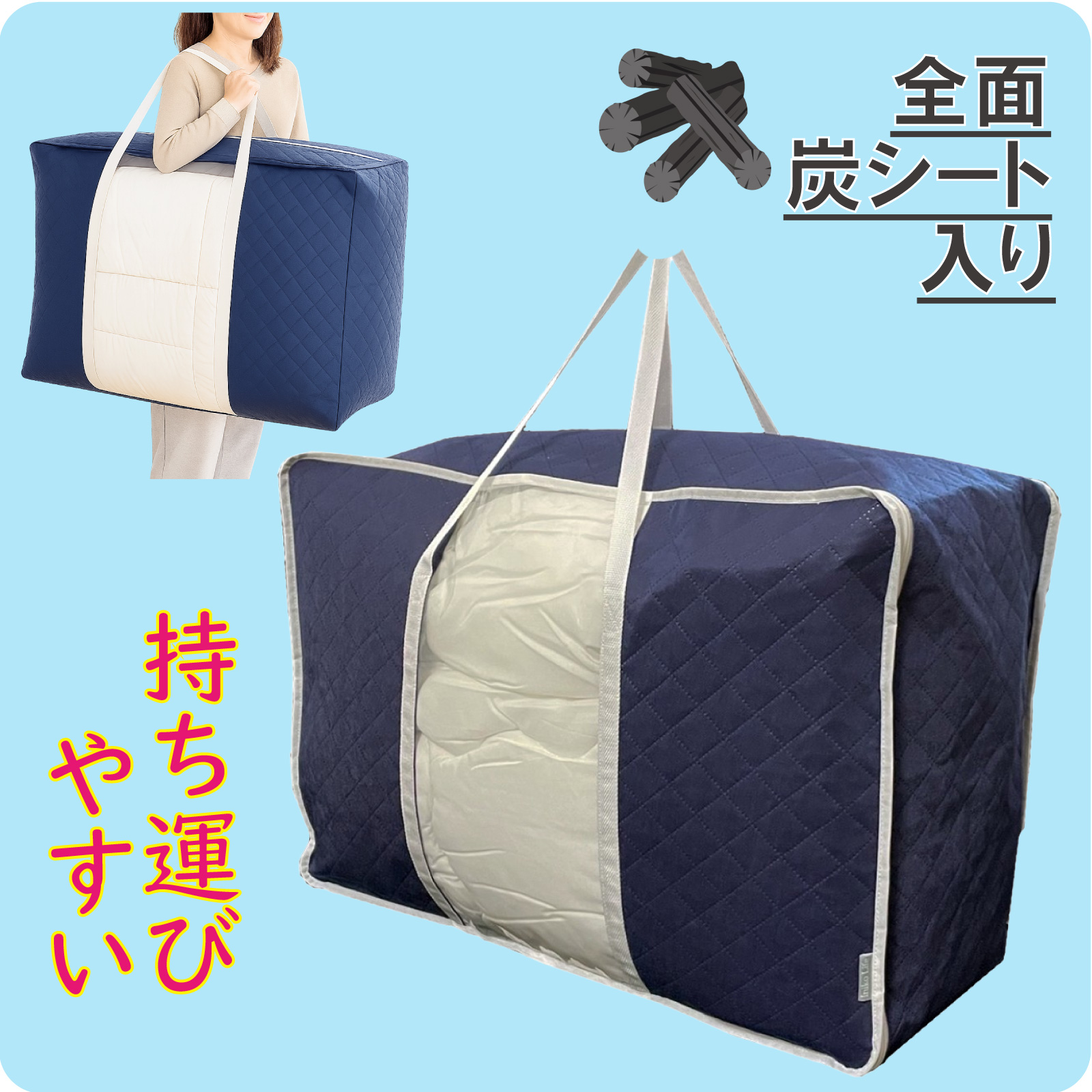 布団収納袋 全面 活性炭シート入 収納袋 ロング持ち手付 布団袋 羽毛布団 シングル - ダブル まで 通気性の良い 厚手 不織布製 布団をスッキリ立てて収納 軽量