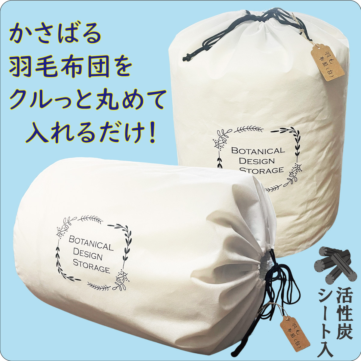 羽毛布団を丸めて(布団の空気を抜きながら)、巾着型ケースに入れるだけでスッキリ