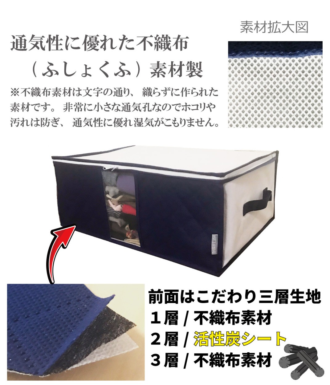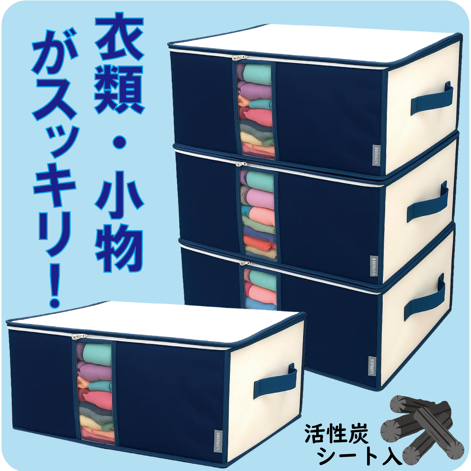 衣類 収納袋 4枚組 前面 活性炭シート入 衣装ケース 収納ケース 通気性の良い 厚手 不織布製 大切な衣類や小物を安心保管 持ち手 透明窓付 折りたためる 軽量