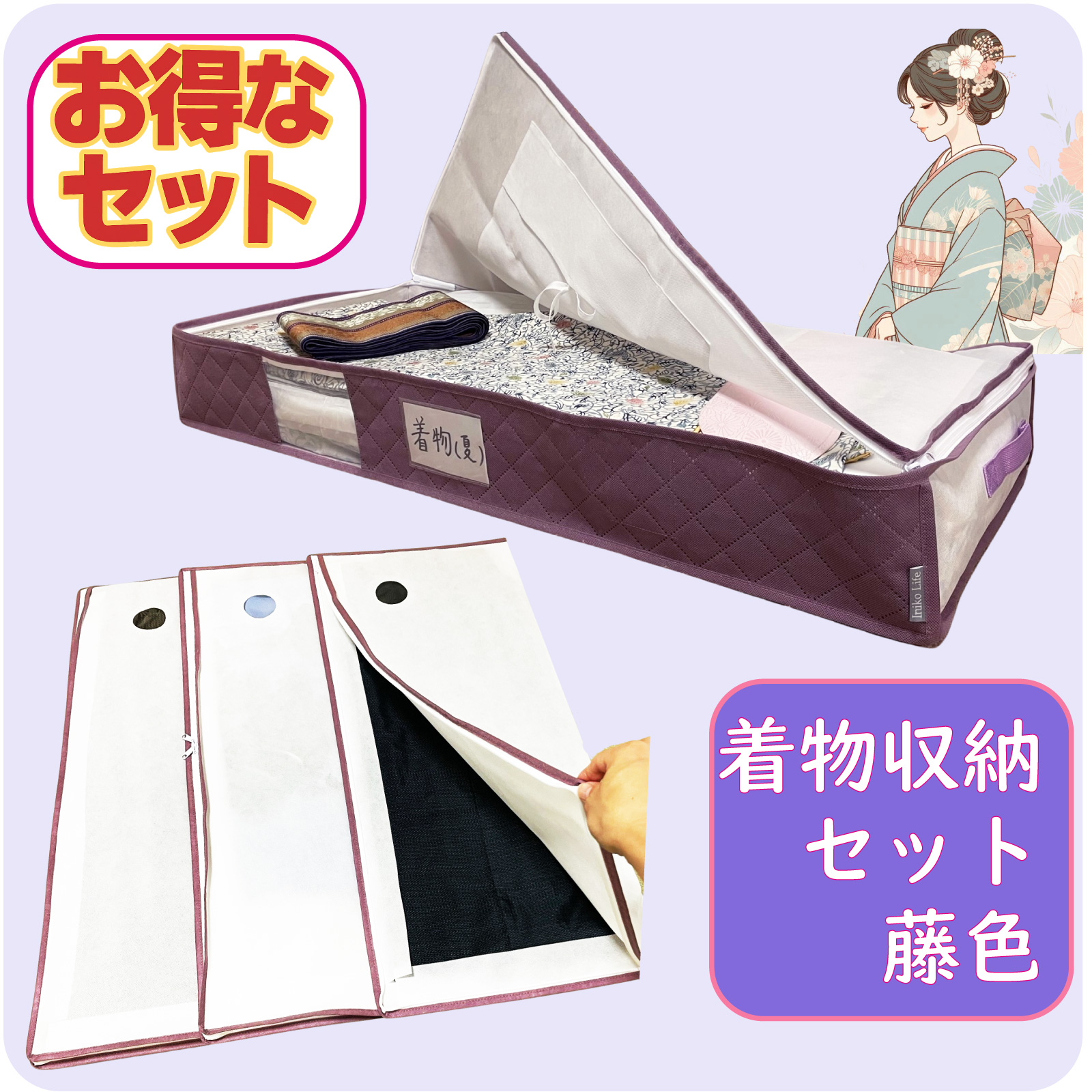 着物収納ケース プラス 着物 収納袋 3枚組 お得な着物収納セット 通気性抜群 不織布製 着付け師が考えたこだわりがいっぱい 大切な着物を安心保管