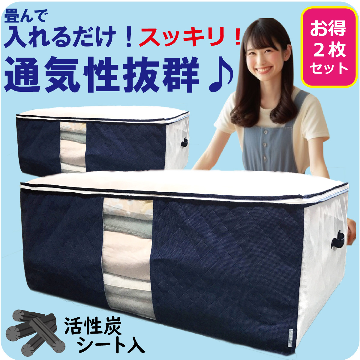 ・通気性に優れた厚手の不織布ケース 寝具を安心保管(前面/活性炭シートを加工)