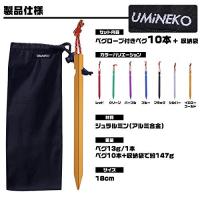 ■18CM ジュラルミン製ペグ 10本セット ●セット内容:ペグロープ付きペグ10本 + オリジナル収納袋 ●材質:ジュラルミン合金(アルミ合金) ●重量:ペグ13g/1本 ペグ10本+収納袋で約147g ●サイズ:18cm ●カラーバリエーション:レッド、グリーン、パープル、ブルー、ブラック、シルバー、イエローゴールド ●高抵抗で抜けにくいY型形状。土砂に接する面積が大きいY型形状が土中で高い抵抗力を発揮。一度打ち込むと抜けにくく、強固な固定が可能です。●指に通して引き抜き簡単 ペグロープ付。すべてのペグにはペグロープが付属しています。ループに指を引っ掛けて引けば簡単にペグを抜くことが出来ます。【高強度&超軽量 ジュラルミン採用】本ペグはアルミニウム合金中、最強強度を誇るジュラルミンを採用。人が乗っても折れないペグは硬い地面にも曲がりにくい特性でしっかり打ち込めるためステークの飛び抜けも防止します。【視認性抜群 色鮮やかなアルマイト加工仕上げ】ペグにはアルマイト加工が施されています。これにより、傷が目立ちにくいだけでなく、軽量性(42g/1本)や視認性、見た目の美しさにも貢献しています。 ●携帯に便利なペグ袋付き。ペグはその用途上汚れが付き物。本ペグ袋は汚れが落ちやすいナイロン生地を採用。ペグと一緒にじゃぶじゃぶ洗ってお手入れ簡単です。●お得な10本セット。テント設営に便利なペグ10本が1セットになっています。色鮮やかなペグはファッション性だけでなく、地面上で映え、紛失や脚の引っかけ防止にも役立ちます。 ●用途:キャンプ設営、テント設営、レジャーシート、レジャーマット、シェード、タープ、ロープ、などの固定、仮止め。海、砂、海岸、砂浜、雪、芝生、河原、庭などに最適。(岩盤質な場所での使用は不向きです)。●利用シーン:キャンプ、ツーリング、ソロキャンプ、釣り(フィッシング)、運動会、スポーツ観戦、海、山、川、BBQ、登山、アウトドア、ハイキング、ピクニック、公園、お出かけ、遠足用レジャーマット(レジャーシート)、銀マット、野外マットの固定、フェス、花見、災害時。 ●定番で飽きのこない使い勝手の良いペグはアウトドア好きの彼氏・彼女・妻・夫への誕生日プレゼントや子供への粋なプレゼントにもおすすめです。また、キャンプ好きなら父の日や母の日、クリスマスなどの記念日にキャンプグッズのプレゼントもオススメ。