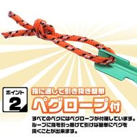 ■18CM ジュラルミン製ペグ 10本セット ●セット内容:ペグロープ付きペグ10本 + オリジナル収納袋 ●材質:ジュラルミン合金(アルミ合金) ●重量:ペグ13g/1本 ペグ10本+収納袋で約147g ●サイズ:18cm ●カラーバリエーション:レッド、グリーン、パープル、ブルー、ブラック、シルバー、イエローゴールド ●高抵抗で抜けにくいY型形状。土砂に接する面積が大きいY型形状が土中で高い抵抗力を発揮。一度打ち込むと抜けにくく、強固な固定が可能です。●指に通して引き抜き簡単 ペグロープ付。すべてのペグにはペグロープが付属しています。ループに指を引っ掛けて引けば簡単にペグを抜くことが出来ます。【高強度&超軽量 ジュラルミン採用】本ペグはアルミニウム合金中、最強強度を誇るジュラルミンを採用。人?