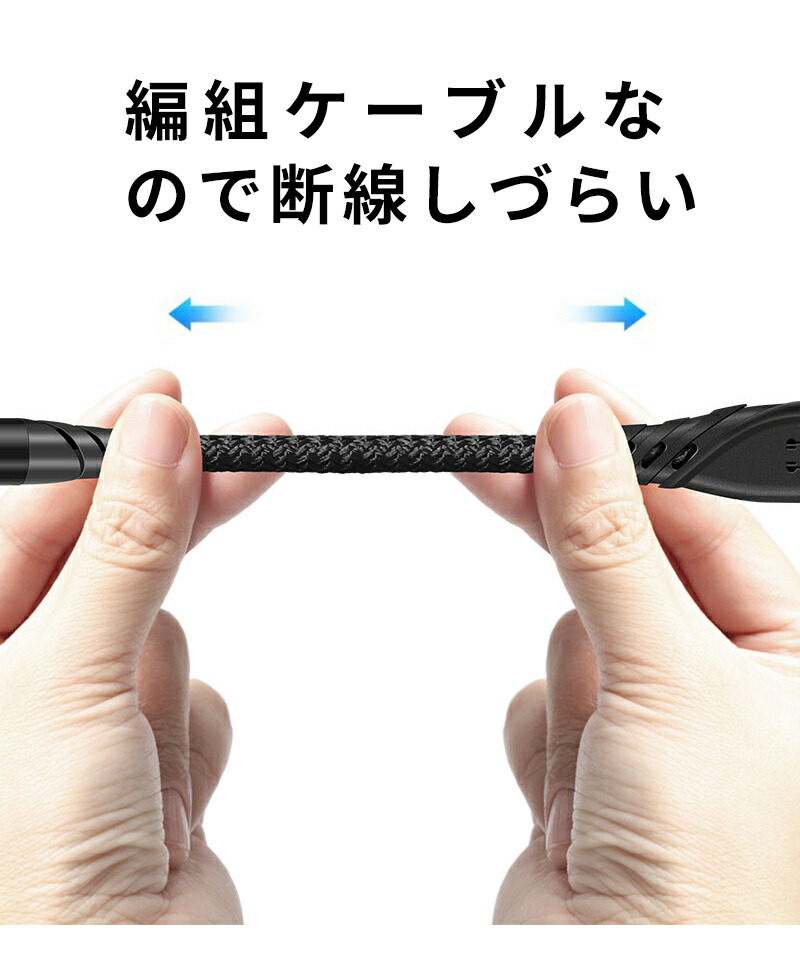 編組ナイロンケーブルで折り曲げても断線しにくく、絡まりにくい耐久性が高いケーブルです。