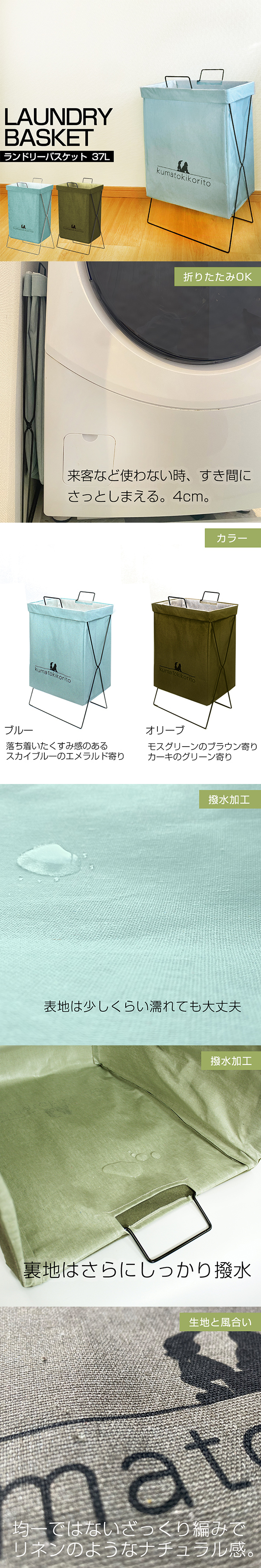 クマとキコリが切り株でひと休みしているロゴがかわいいランドリーバスケット。ざっくりとした麻(リネン調)の生地がおしゃれです。おりたためるでの洗濯機横のすき間にフィット。内側ははっ水加工がされているのでランドリーボックスやダストボックスとしても使用できます。ランドリーBOX・ごみ箱の他には、おもちゃ箱やストックボックスなど、様々な用途に使えるマルチ収納ボックスです。持ち手もあるので移動も楽チン。バスケットを外して持ち手付きのバッグとしても使用可能。37リットルの大容量ですが、バッグとして使う場合には40リットル近くまで入れられます。可愛いくすみブルー(スカイブルー・水色)とオリーブ(カーキ・モスグリーン)の2色です。