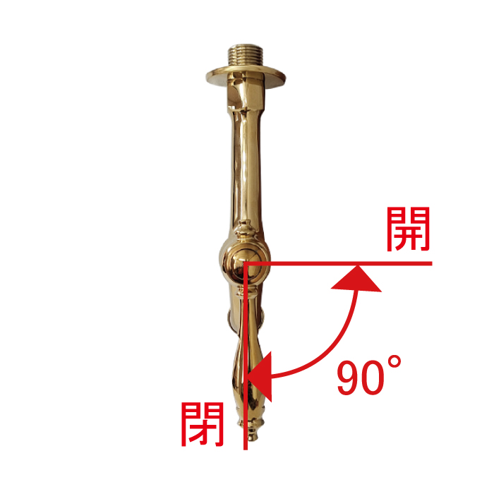 ハンドルを90°回すことで水を出したり止めたりすることができます。 90°以上回そうとすると故障、破損の恐れがあります。 |