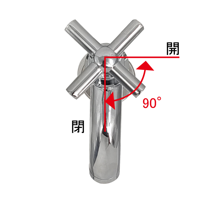 | ハンドルを90°回すことで水を出したり止めたりすることができます。 90°以上回そうとすると故障、破損の恐れがあります。 |