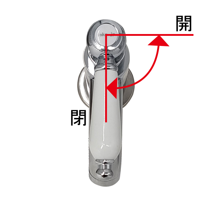 | ハンドルを90°回すことで水を出したり止めたりすることができます。 90°以上回そうとすると故障、破損の恐れがあります。 |