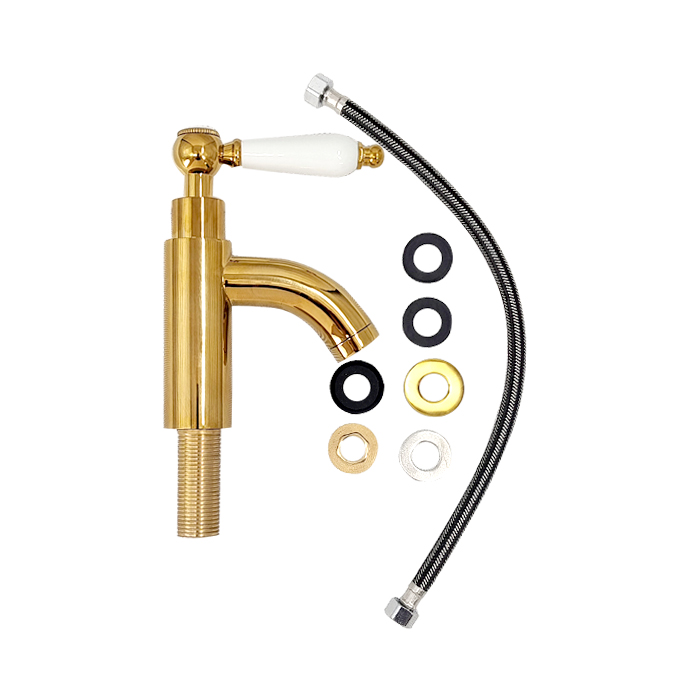 | 本体1個 台座 1枚 ナット1個 ワッシャー1枚 パッキン2枚 ガイド用パッキン1枚 フレキホース1本 ガイド用パッキンとは水栓を取り付ける穴が35mmであいている場合に使用する事で隙間を無くすパッキンになります。 |