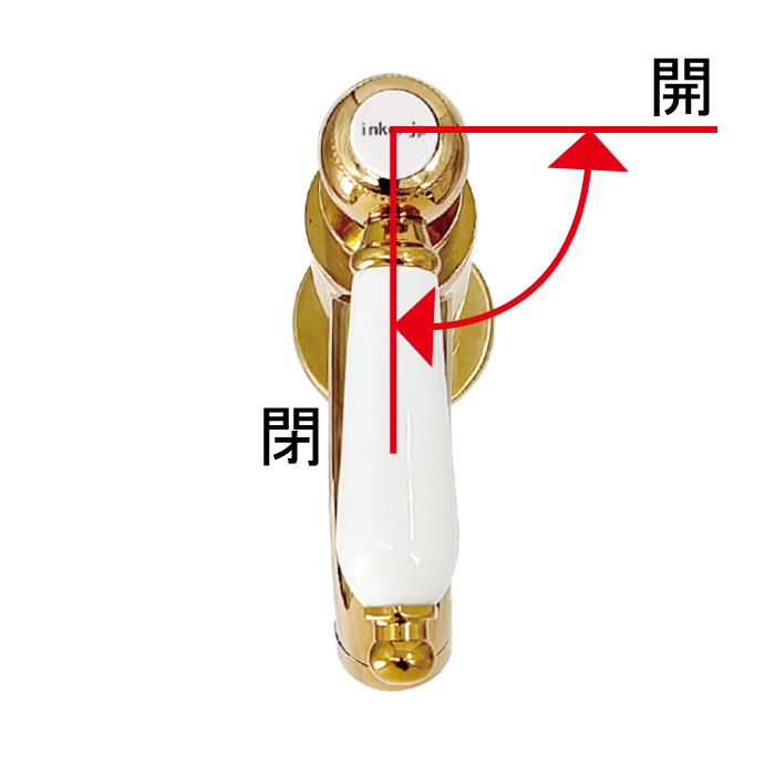 | ハンドルを90°回すことで水を出したり止めたりすることができます。 90°以上回そうとすると故障、破損の恐れがあります。 |