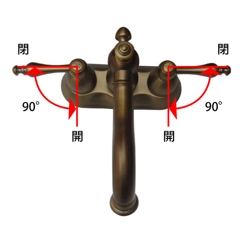 | ハンドルを90°回すことで水を出したり止めたりすることができます。 ※限度以上に開閉しようとすると破損の恐れがあります。 レバーの左右で冷水、温水の切り替えが出来ます。 吐水口は360°可動します。 |