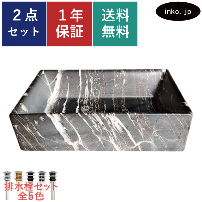 洗面ボウル 大きめ 角型 陶器 置き型 黒 マーブルブラック オーバーフロー無し W600×D400×H160 品番INK-0403410H