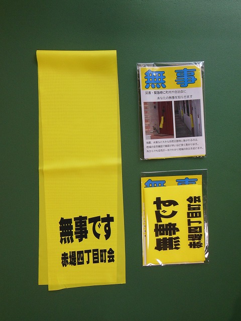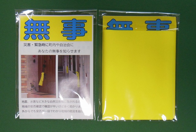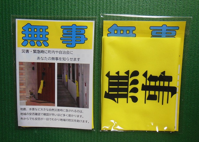 災害時の安否確認黄色旗(たすき)災害時、無事な家庭に「黄色い旗(たすき)」を玄関先に出してもらい、救助が必要な人を早く見つけ。迅速な安否確認が助かる命を助けます。また、災害時には、救助隊・警察・自衛隊・ボランテアなど各種団体の救助作業に役立ちます。黄色い旗で安否確認災害時「大丈夫な家庭」の目印に黄色い旗(たすき)
