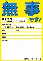 地域住民・家庭の安否確認シール災害時の安否確認シール災害時、無事な家庭に「安否確認シール」を玄関先に出してもらい、救助が必要な人を早く見つけ。迅速な安否確認が助かる命を助けます。また、災害時には、救助隊・警察・自衛隊・ボランテアなど各種団体の救助作業に役立ちます。黄色い旗で安否確認災害時「避難状況連絡」に避難確認シール