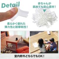 (素材)ポリ塩化ビニル(PVC)。PVCは、柔軟で弾力があり、衝撃に強いのが特徴です。また、汚れも拭き取るだけで綺麗に払拭出来ます。耐久性や耐疲労性、耐燃性も優れております。 (デザイン・カラー)無色透明タイプ。丸型。透明でシンプルなデザインは、家具の美観を損ねることなくお使いいただけます。粋でスタイリッシュなデザインをお求めの方には、是非オススメです。(サイズ・セット数)高さ:約2.5cm 幅:約2.5cm 上底部:直径約3cm 内角:約2cm。一般的な家具や机の鋭角に「ピッタリ」と取り付けられます。(※取付箇所の高さや幅に関わらず、角であるならば、高さ違い、幅違いも全てカバー致します。)1商品=8個入り。意外と必要な取り付け箇所は多いものです。1回で使い切らなくとも予備としても保管出来ます。大変お買い得な商品です。(特徴)商品は、柔軟性と弾力性に優れおります。赤ちゃんや子供が頭や身体をぶつけても怪我や思わぬ事故の未然防止に役立ちます。粘着テープも付属します。