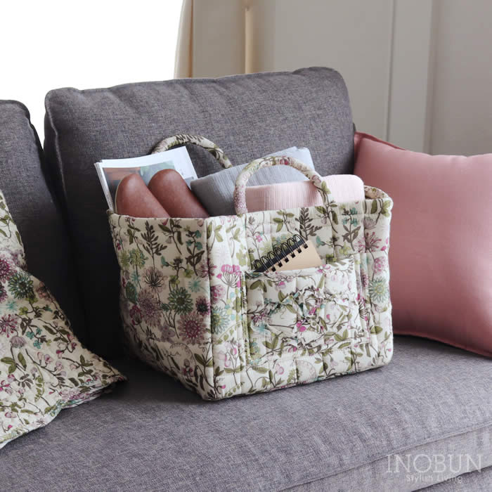 リビングでも子供部屋でもマルチに使えて大活躍! イノブンの店舗でも大人気!持ち運びも便利な柔らかなキルトバスケットが登場♪ お部屋にクラシカルな華やかさを。