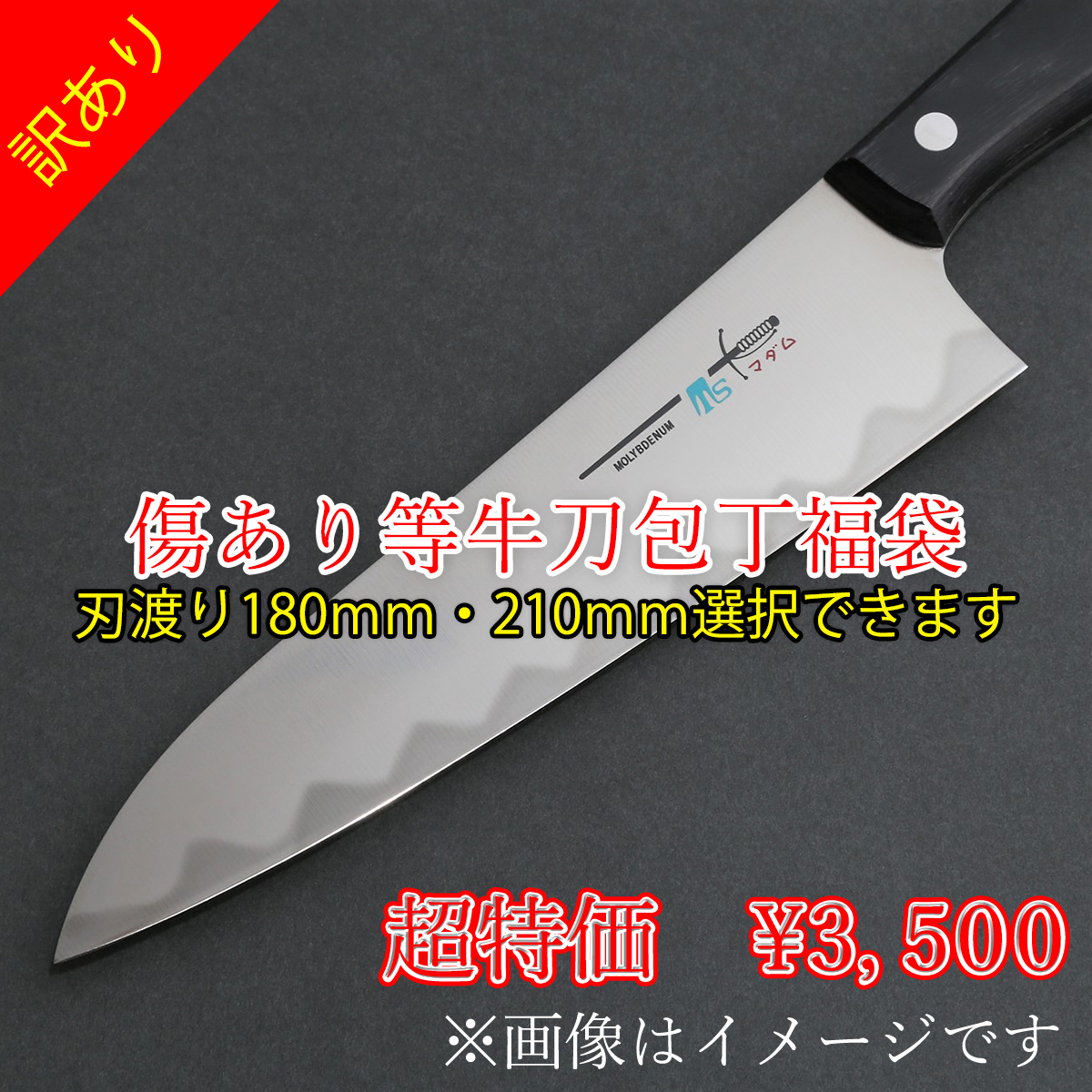傷あり・ショットのずれ・ハンドルの欠けなどで1級品としては販売不可ですが使用上の問題がない牛刀包丁を当店スタッフがランダムにて発送させていただきます