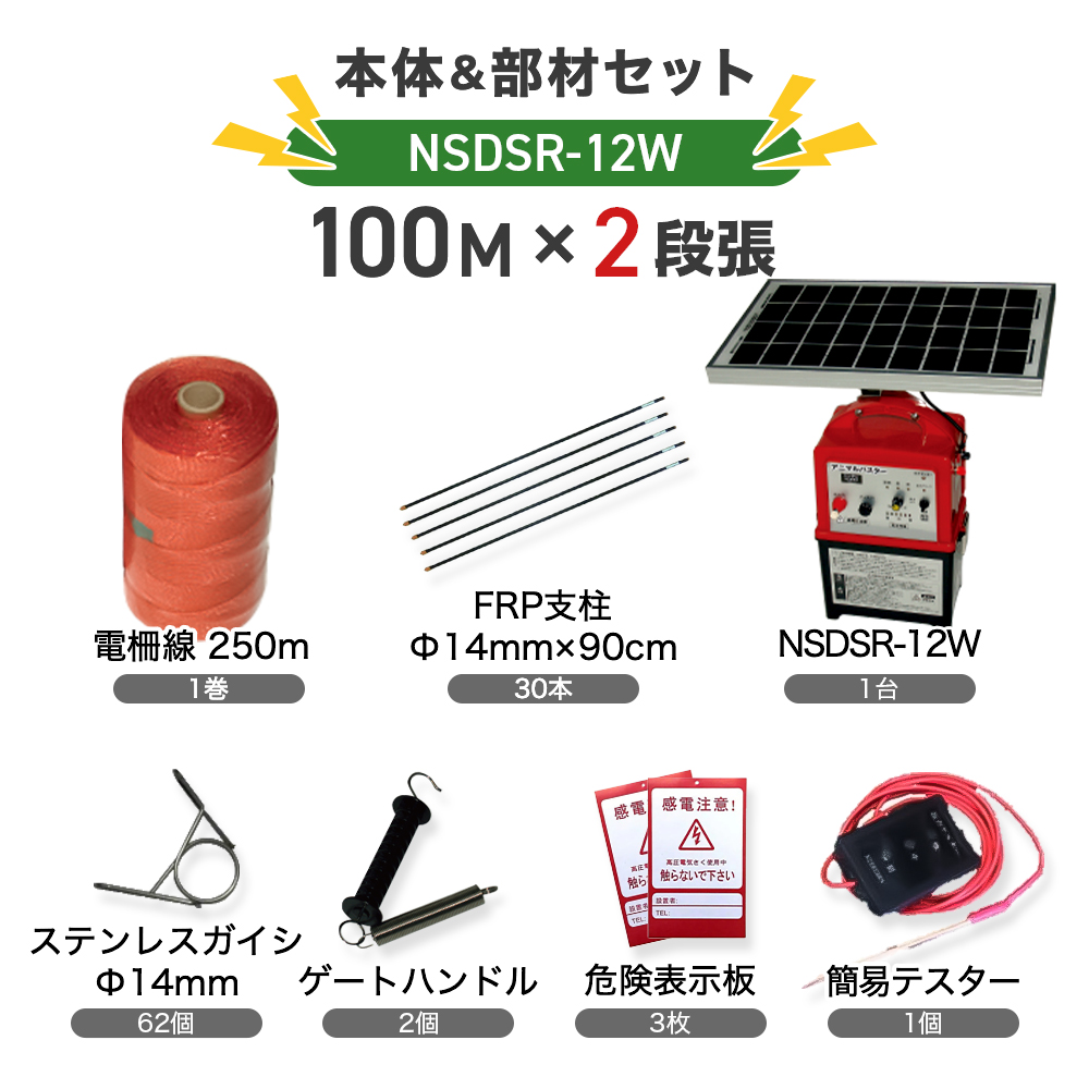 ○本体+周囲100m×2段張りの支柱や電線がセットになった商品です。周囲100mの敷地におけるイノシシ対策におすすめのセットになります。