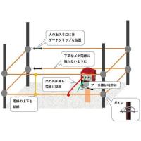 周りに高い木や電柱など、飛び込み出来ない位置に設置します。支柱(図中のFRPポール)は20〜30cm地中に打ち込みます。ポールの間隔の目安は300〜400cmです(地形によって調整します)。ガイシはポール1本あたり8個、20cm間隔にて取り付けます。接続線は2本1組とし、50cm間隔で接続します(段違いで+、−につなぎます)。