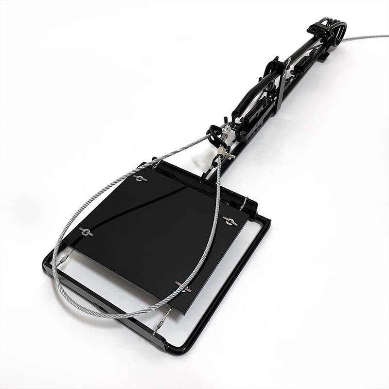 ◎踏み板とバネ(オリジナル製造のねじりバネを採用)が一体構造になっています。アームのフックをトリガーに引っ掛けてワイヤーを引っ掛けるだけでセット完了です。