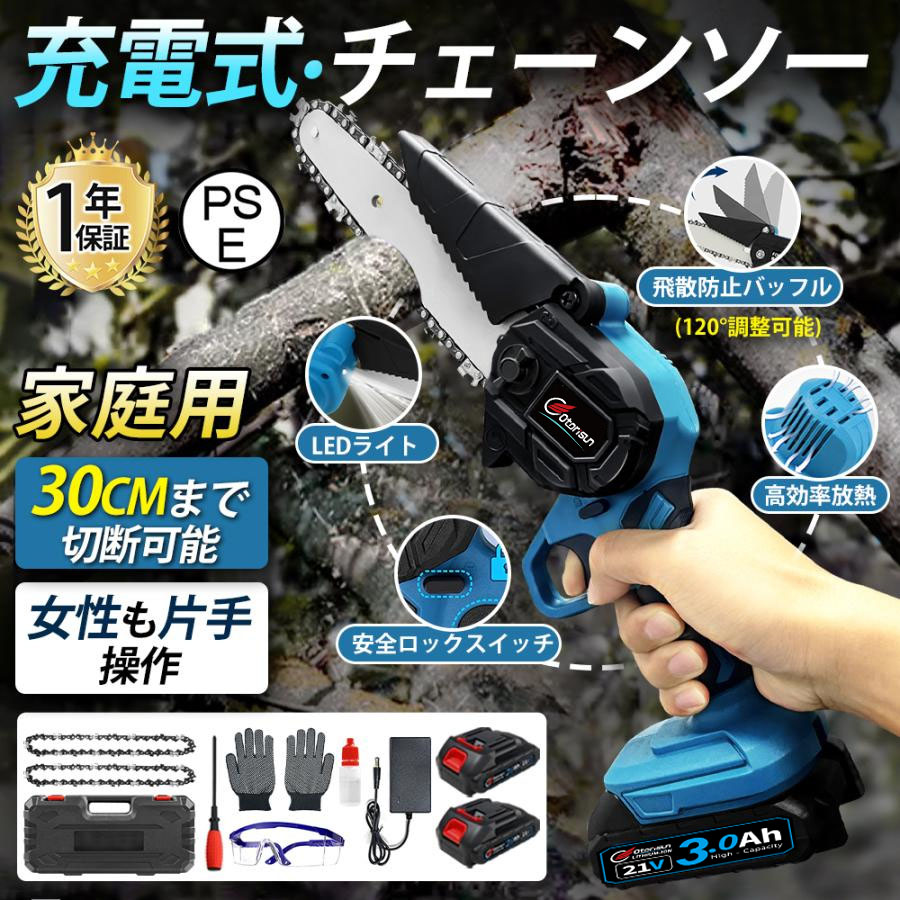 付属品:チェーンソー本体*1、バッテリー*1、充電器1*、収納箱*1、チェーン*1、ドライバ*1、ゴーグル*1、手袋*1、オイルボトル*1