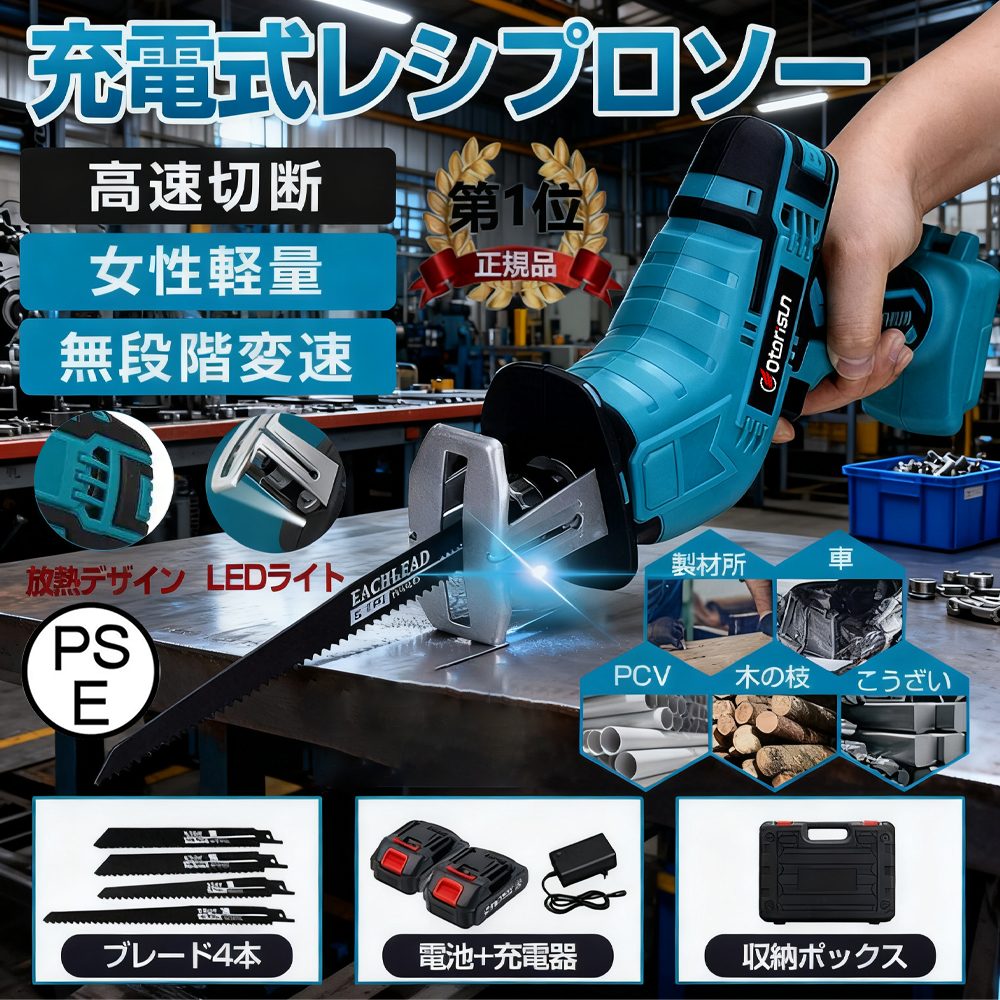 【正規品】【即納】レシプロソー 充電式 電動ノコギリ 電動のこぎり 小型チェンソー 21V マキタバッテリー互換対応 高速切断 女性 工具 ブレード4本付き 2025