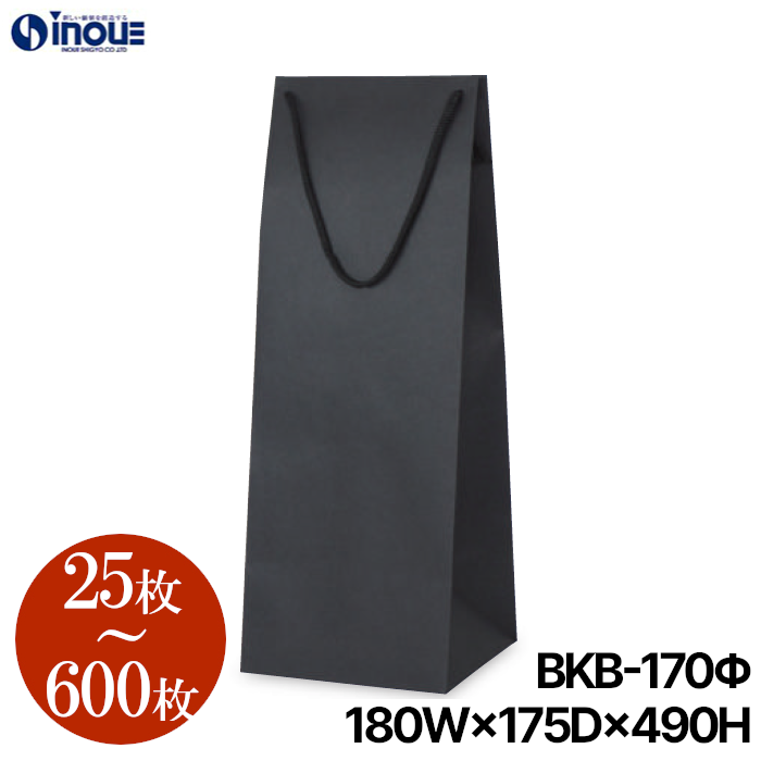 高級手提げ紙袋のBK-クラフトシリーズと同じ黒色のクラフト紙を使用した高級感のある黒色で無地ワイン用紙袋です。 縦長なため、ワイン以外でも長いものを入れるのに最適です。底ボール付きです。
